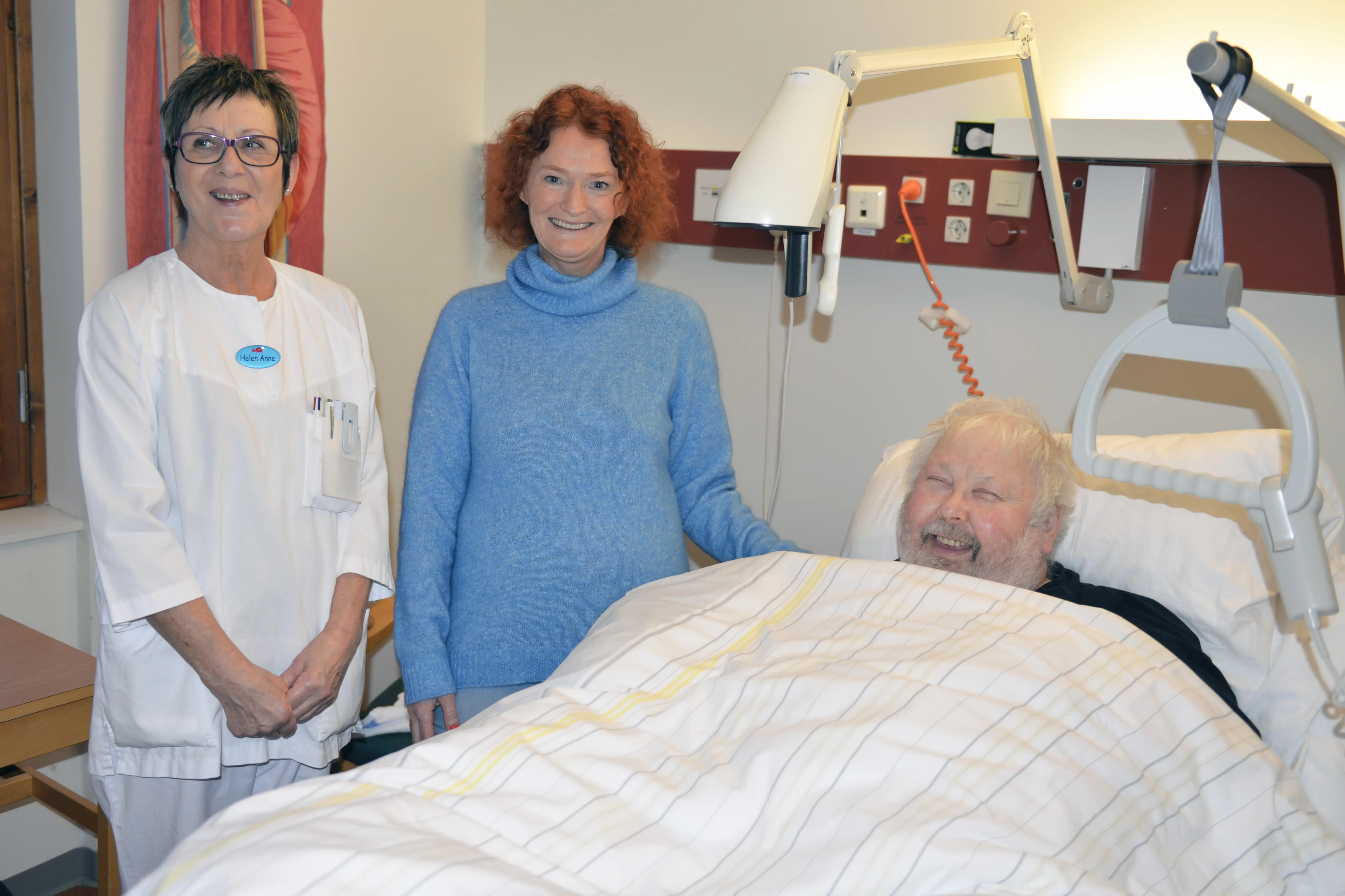 - Jeg har vært pasient ved mange sykehus og vet at det ikke nytter hvor fine husene er, det er menneskene i dem som teller. Jeg kunne ikke blitt tatt bedre vare på enn det som er tilfellet her, sier pasient Jon Sumstad. Her sammen med hjelpepleier Helen Sørensen og områdesjef Ann Merete Brevik.